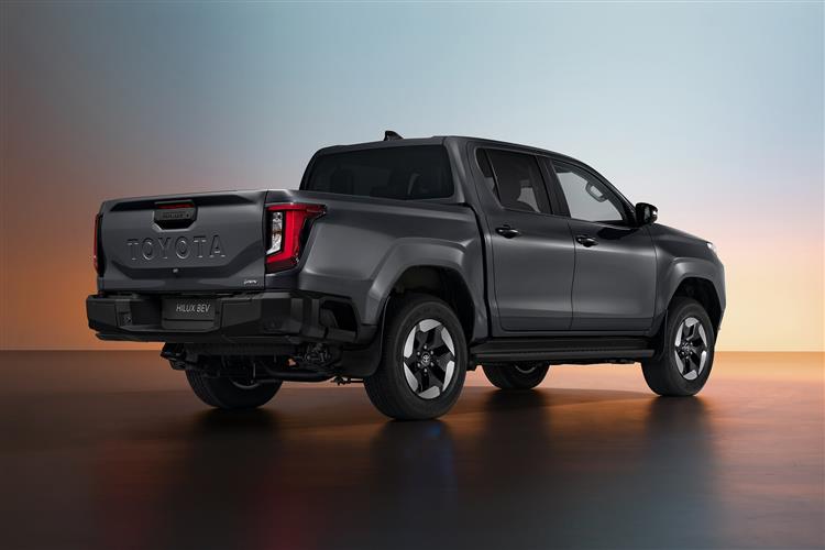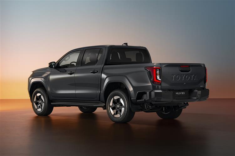 Toyota was after a more powerful look for this ninth generation model, styled around what the brand calls a 'Tough and Agile' theme supposed to deliver a stronger-looking stance, which is now more upright and aggressive. The dimensions haven't changed much, the 5.3-metre overall length a negligible 5mm shorter than before. Slim headlamps are linked by a central Toyota-branded bar and the tail lamps are redesigned too. You'll spot the BEV version by its lack of a frontal grille and the electric model has a dedicated alloy wheel design too. Only the doublecab body shape is now available, which will be a disappointment to the small number of farmers and builders who previously bought the single cab and super cab versions. Inside, there's an all-new and much improved interior which borrows much from the current Land Cruiser SUV, though with a few more hard plastics. That means squared-off shapes as part of an upright dashboard. Through the three-spoke wheel, you view a 12.3-inch instrument screen that includes a display of how power is being fed to the front and rear axles. The infotainment monitor is set high on the dashboard and is also 12.3-inches in size, complete with plenty of connected services and functions. The driving modes are selected using a rotary dial on the centre console. You activate the off-road settings using the same dial after pressing the drive mode button next to it. The climate functions are, thankfully, separated out from the screen, but look a little dated. As before and as usual with a doublecab pickup, the rear seat backrest is rather upright, but it'll be fine for short-to-medium journeys. And there's space beneath the base to store things, with a useful 60:40-split tip-up function so that valuable things like tools can be kept away from prying eyes.