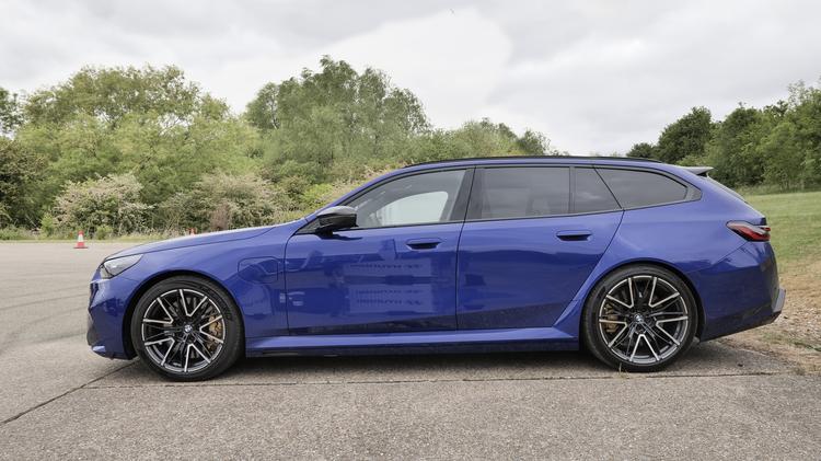 This car's S63 series 4.4-litre V8 is the most potent engine ever devised by BMW's high performance M division. Which is just as well because it has to carry around a lot of weight. Still, 270kg of that extra bulk is there to facilitate the electrified addition to this M5's drivetrain that's increased total output so much. From 625hp in the old F90 M5 Competition to 727hp here. 585hp of that is from the engine and 197hp from an electric motor energised by an 18.6kWh battery large enough to make this a performance PHEV, with an all-electric range of up to 42 miles. Ignore the EV drive modes and this M division-curated confection shrugs off its prodigious 2.5-tonne kerb weight with bombastic speed, 1,000Nm of torque this super station wagon to 62mph in 3.6s en route to 189mph (if the optional 'M Driver's Pack' is fitted). Power is channelled via a toughened-up version of the 8-speed automatic transmission you'd find on a regular combustion 5 Series Touring and there's a 'Boost' mode you can activate to prompt faster acceleration by pulling on the wheel's left hand gearshift paddle. So it's fast enough in a straight line. Where you might worry, given all that powertrain bulk, is in this beefy G99 series M5 Touring's ability to tackle the turns. The Garching engineers fretted about this too and spent six years on handling development of this seventh generation M5 design as a result. For sharper corner turn-in, they added rear-wheel steering ('Integral Active Steering' in BMW-speak), which can turn the back wheels by up to 1.5-degrees. Plus there's a wider track, re-tuned steering, bespoke kinematics and elastokinematics on both axles and an adaptive suspension set-up able to adjust the new Bilstein dampers independently at each wheel. BMW's resisted the temptation though, to add the active anti-roll bars that are fitted to the M60 Touring EV; apparently, the M5's passive ones give more linear, natural levels of body roll. Thanks to the Hybrid system, there's a wide choice of drive modes - 'Hybrid' and 'M Hybrid' (which mix the power sources), 'Electric' (full-EV), 'Dynamic' (for track and fast road driving) and 'Dynamic Plus' (for all-out system power). All that's before you start accessing the centre screen to adjust chassis, steering, brakes, all-wheel drive and transmission, saving your preferred to settings to the red M paddles provided for the purpose behind the steering wheel. On the move, expect to notice this G99 series model's weight; but on tighter roads, you'll notice it's prodigious width even more.