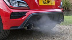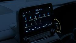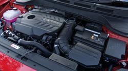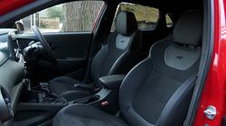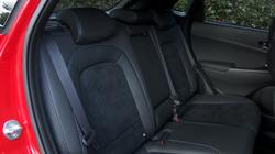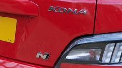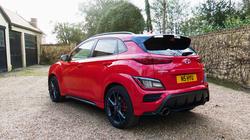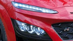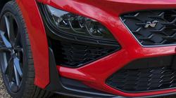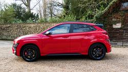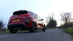 Even the engine gets 'N Turbo' branding and the bodywork gets lots of body-coloured design elements with N-exclusive red accents. From the side, you'll notice the lowered ride-height, the smart N-branded lower side sills and the black-framed glasshouse with its black roof rails. And of course the exaggerated arches house big wheels - dark satin-painted 18-inchers with red N-branded calipers peeping through the spokes. You'd also want overtaking presence with a car like this - and the Kona N provides it, with large air openings needed to cool the powerful N-tuned engine. The leading edge of the bonnet gets these slim Audi-style nostril outlets, flanked by LED daytime running light slivers. At the rear, a large, double-wing roof spoiler dominates the view, incorporating a triangular third brake light. Lower down, the rear bumper's almost taken over by a large red-accented ribbed diffuser which enhances the airflow departure and minimises turbulence, incorporating two huge tail pipes, one in each lower quarter. Inside, this cabin's full of serious statements of intent. Like the firmly contoured blue-stitched steering wheel with its silver paddleshifters, blue N mode paddles and prominent red 'N Grin Shift' button. And the N Sport Seats with faux-leather and suede upholstery that grip you properly around the nether regions. All the performance detailing you'd want is present and correct too; a perfectly positioned blue-striped gear lever; race-style silver pedals; and blue stitching to decorate the handbrake and the gearshift gaitor. Fans of fast, small shopping rockets will love it all. But not perhaps quite as much as what they'll find on the two 10.25-inch screens that dominate the dash. Prod the right hand blue N wheel paddle and the Digital Supervision Cluster transforms from a twin-dial display into a single rev counter gauge, to the rather chintzy accompaniment of a fiery ring. And the complementing Centre Console Display monitor in the middle of the fascia has an 'N mode' section with a home screen for serious drive info: or you can swipe across to Custom screens that allow you to tailor responses for engine, steering, suspension, transmission, the e-LSD limited slip differential, the ESC stability system and exhaust sound. Plus you can also activate Launch Control for Grand Prix getaways and select from a further menu of 'Performance Options'. Brilliant. The rear seat doesn't do anything clever like slide or recline but by small SUV standards isn't too bad for the carriage of two folk, providing they're not especially lanky of leg. If they are, then compromises will be need to made by the front seat occupants in order to be able to accommodate them. We'll finish with a few words on boot space. The tailgate is light to lift and reveals the same 374-litre luggage area that you'd get in any ordinary Kona, which is 82-litres less than you'd get in a rival Ford Puma ST. Push forward the 60/40 split-folding rear seat and you'll reveal a relatively flat loading floor with as much as 1,143-litres of total fresh air if you load to the roof.