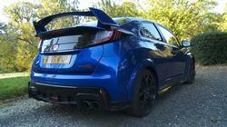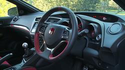 Honda calls this 'a race car for the road' and you certainly get that feeling the first time you make this Type R's acquaintance. If you were about to buy into the subtle understatement of a direct rival like a Volkswagen Golf R, an Audi S3 or a BMW M135i, then look away right now because you won't like it. The in-your-face styling treatment is much more likely to appeal to someone attracted by one of the more overt lesser hot hatches from this era - say a Ford Focus ST or a Megane Renaultsport - but who likes the idea of power and aggression being turned up a notch. All of which is fine with us: it's nice to see a different approach in this segment. Not everyone feels shy about owning a superfast shopping rocket. If you don't and want everyone to know that you've got one of the very quickest, then here perhaps, is your car. The colour-coded aesthetics and piercing LED front lighting technology certainly makes its point but ultimately, in taking this Type R seriously, it helps to know that all those wings, slashes and spoilers are there to make the thing go faster rather than merely make it look quick. So you need those huge grilles in the front bumper section to cool the 2.0-litre VTEC Turbo powerplant, with airflow channelled through the engine bay to the outlet vents on the trailing edges of the blistered front wheelarch extensions, fashioned from aluminium to save weight. The same vents cool the bigger Brembo brakes, while the front bumper has been designed specifically to inhibit air turbulence around the front wheels, enhancing high-speed stability and further reducing lift forces. Move to the side and you've very much the kind of profile you might expect from a Civic on steroids. Again though, look beyond the Max Power excess to the intricate engineering that's prompted it. You're given lightweight high-rigidity 19-inch alloy wheels shod with Continental tyres that were created through a bespoke development programme designed around the unique handling characteristics of this car. Then there are deep side skirts that, like the wide front splitter, are another key factor in reducing lift, creating downforce and pinning the car to the road. The huge rear wing also does that of course, combining with an almost completely flat underside to further suck this Civic into the tarmac, with aerodynamics carefully enhanced by the design of the potent-looking piano black gloss rear diffuser, with its prominent dual tailpipes. It's the sort of thing you'd get on a racecar. Further up, stylised rear combination lamps feature LED light bars that complete a distinctive visual signature. Inside, the differences over the standard Civic are rather more restrained. The high-backed competition-style sports seats with their red belts are the main change, the kind of thing you'd have to pay extra for on most rivals, with prominent side bolsters for greater lateral support through the kind of extreme cornering Honda thinks Civic Type R owners will habitually engage in. You get lovely suede-effect black fabric with red double-stitching and positioning that places you further down into a floor itself already lowered, a combination that leaves you sitting 30mm closer to the tarmac than you would be in an ordinary MK9 model Civic. Typically for a Type R model, the gear knob is fashioned from machined aluminium alloy, which looks nice but feels freezing in winter, while branding your palm with the gearshift chart in the heat of summer. It's beautifully positioned though, falling perfectly to hand, as close to the steering wheel as it could be for easy access to the short shift throw that gives you lovely, quick snikerty changes. Ah yes, the wheel - the other point of Type R cabin differentiation. It's a proper flat-bottomed leather-trimmed affair with slimmer spokes for a more tactile feel. Serious intent is underlined by a red-stitched centre-position marker at the top of the rim, the kind of thing you get on all serious sportscars for a visible indicator of the steering wheel angle when cornering. We also love the plaque you get attached to the transmission tunnel showing your car's individual production number. Otherwise, the feel and architecture of this cockpit is much as it would be in any ordinary Civic, a wilfully futuristic look that combines dual-plane architecture with a curious mixture of analogue and digital instrumentation. Directly ahead of you are three deeply recessed sporty dials, the Type R-branded rev counter appropriately taking centre stage, with the two outer gauges flanked by buttons for the engine start system and the 'R+' performance mode that changes the instrument backlighting to a potent red. Above this main binnacle lies what Honda rather pretentiously calls the 'Driver Interface Zone', an upper display that arcs over the main instrument binnacle and is viewed above the steering wheel rim, gathering essential information like speed at the natural point of eye focus. Also conveniently in your eyeline is the so-called 'i-MID' 'Multi Information Display screen sited slightly to the left that updates you on things like the time, plus audio and trip computer functions, as well as a whole range of Type R-specific features. You get read-outs for boost and oil pressure, water and oil temperature, along with information on cornering G-forces and your brake and throttle pedal positioning. There's also a lap timer, plus something we'd not seen before - the glorious option of measuring your own 0-62mph or 0-quarter-mile acceleration times. Brilliant. Anything this i-MID screen can't tell you will probably be covered by the 7-inch colour 'Honda Connect' infotainment touchscreen, positioned above the climate control switchgear in the centre of the dash. Annoyingly for Apple users, it's an android-based set-up. Still, if that works for you, then you'll be able to use the display's 'pinch, swipe and tap' functionality and its clever 'MirrorLink' function that allows you to mirror your mobile han