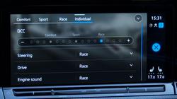 By and large, extrovert customers in search of a super hatch don't tend to choose a Golf R. This Volkswagen has mastered the concept of superfast speed in a subtle suit, but the Golf GTI also champions that approach; this R model must look stage more serious. It did in this MK8 form. At the front, the bespoke R-style bumper features a motorsport-influenced spoiler, body-coloured side wings, high-gloss black elements and R-specific air intake grilles. Further up, the top radiator grille gets an R badge and a blue crossbar to differentiate this model's top performance status, this bar lighting up as an LED strip as soon as the engine starts and stretching all the way into the wings as a daytime running light, via illuminated strips in each LED headlamp unit. In profile, you'll notice the wheels first. Standard R models get 18-inch 'Jerez' rims featuring blue R calipers for the larger 18-inch brake system. At the rear, an R logo sits between the LED tail lights, but the attention of Golf R cognoscenti will be focused further up. They'll want to see if you've stretched to the Performance Pack variant, which gets a huge Performance rear wing to cope with its higher 168mph top speed. At the wheel, the cabin has a bespoke feel, with R-branded sports seats featuring blue checked 'Sardenga' upholstery and integrated head restraints. Plus brushed stainless steel pedals; carbon-style dash panel applications; a black headliner; and R-specific door trim that echoes the alcantara-style 'Art Velours' trim on the seat bolsters. And, as in any Golf 8, screens dominate the cabin architecture, a 10-inch central 'Discover Media' infotainment monitor and a 10.25-inch 'Digital Cockpit Pro' instrument binnacle display. The latter has a so-called 'Sport skin' which gives you an R-branded central round rev counter. Which you can change to an 'R-View' layout with horizontal rev counter at the top edge of the display. Away from media features, perhaps the unique sports steering wheel is the nicest touch, fitted out with properly-sized tactile gearshift paddles, rather than the rather apologetic small plastic items you get on a Golf GTI. To manually switch ratios, you either use these or the shift-by-wire buttons next to the stubby gear selector on the centre console. On the left steering wheel spoke is the small blue R button you'll need for direct selection of the various driving profiles; a long press takes you straight to blue mist R mode with its throaty exhaust note. Thanks to the extra 16mm of length between the wheels with this MK8 Golf design, there's a fraction more legroom in the rear than there was with the previous generation model, so a pair of six-foot adults could be accommodated reasonably here, though knee room begins to get pretty tight once front seat occupants start to slide their seats back. As for the boot, well your seller might reference the fact that the 381-litre space provided here is a little bigger than the trunk you'd get in a rival Mercedes-AMG A 35 or A 45. But that of a Honda Civic Type R is a substantial 39-litres bigger. Still, the room you do get here is very usable and five carry-on cases or a small set of golf clubs or a baby buggy would easily fit. Pushing forward the conventional 60:40 split-rear bench you do get frees up 1,237-litres across a load area that'll be virtually flat if you have the boot floor in its upper position.