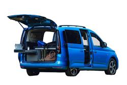 Staycations. You can't beat them can you? If you're of that mind set, Volkswagen wants you to consider this, the Caddy California. 'California' is the Wolfsburg maker's designation for 'motorhome'. Once, it just designated a camper version of the Transporter van. Then in 2020, a bigger Grand California model based on the larger Crafter LCV was introduced. And a year later, the Caddy van got a motorhome variant too. This one. Given that the Caddy is a commercial vehicle with roughly the dimensions of a Golf, you might think that what it could offer to motorhome folk would be fairly limited. But this is no ordinary Caddy, converted to incorporate a double bed, a mini kitchen and a chair and table package - all have been squeezed in. Basically, there's the convenience of a car for weekdays and the versatility of tent for the weekends. If that sounds appealing, read on.
