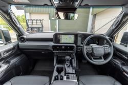 This J250 Land Cruiser Commercial campaigns with a 48V mild hybrid electrified version of the usual 2.8-litre diesel Toyota uses for this model. Like the previous conventional version of this unit, it develops 201bhp, offers 500Nm of torque and will tow up to 3,500kg. The mild hybrid system's 48V lithium-ion hybrid battery has 13 cells and a 4.3Ah capacity. When fully charged, it can supply up to an additional 12kW of power and 65Nm of torque to the powertrain at start-off. If ever a Land Cruiser switched to the kind of monocoque construction used by more tarmac- orientated large SUVs, it wouldn't really be a Land Cruiser. This one sticks with a traditional body-on-frame architecture, but mates it to the brand's latest GA-F platform. The idea of course is to preserve this model's legendary off road prowess, further enhanced here with greater wheel articulation. Another key improvement over the previous generation model is the disconnecting front anti-roll bar, which can be disengaged via a button on the dash to give maximum wheel articulation on really testing trails. The Multi-Terrain Select drive mode system's been enhanced too, the set-up adapting vehicle performance to suit various kinds of off-road conditions. Plus 'Crawl Control' can be used to maintain a low speed in off-road/downhill driving. It governs engine torque and brake pressure, avoiding wheelspin and wheel-locking and allowing the driver to focus on the steering. Where this J250-generation Land Cruiser really had to improve though, is away from the rough stuff. Toyota somehow had to make it a better tarmac tool without compromising this model line's renowned off-road ability. And the developments in that regard are promising. Combined body and frame rigidity is up by 30% aided by that new platform, which reduces body roll and contributes greatly to handling responsiveness. This J250 Land Cruiser was the first Toyota to use a Stabiliser Disconnect Mechanism, which has the dual benefits of enhancing off-road performance and a more comfortable ride on standard roads. Using a switch on the centre console, the driver can unlock the front anti-roll bar (stabiliser), increasing suspension travel. Toyota claims the new electric power steering system is more feelsome too.