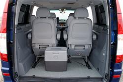 Two trim levels are available, Trend and Ambiente. Whichever model you choose, common sense practicality comes as standard. The ergonomics are impressive and the dash-mounted gear lever is a nice touch. The passenger compartment features a rail system that allows for a wide variety of seating configurations. Fore and aft adjustment and flexible repositioning of the individual seats and benches is easily achievable while both the seats and the benches can be folded flat or tilted fully forwards. The 25mm hole pattern in the floor means that the seats can also be rotated to face in almost any direction, opening up the possibility of a cosy face to face seating position. If you want to cut a dash on your street, the Viano may well pull up short. It does look a little swoopier than a V-class, especially around the front end, but the silhouette is still a good deal more commercial than classy. Still, the front is nicely rounded and there are some rather extravagant swage lines along the flanks. The rearmost side window profile is also quite neat, but if it's smart aesthetics you're after, the Renault Grand Espace shows the Mercedes how things are done. The Mercedes counters by offering a more interesting range of engines and added versatility as well as that cavernous interior. Those looking for unparalleled practicality in a big MPV will celebrate the fact that Mercedes hasn't been tempted to follow a more ostentatious route.