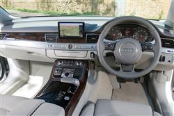 Never one of the luxury saloon sector's most ostentatious players, the A8 tends to maintain a cool studied elegance in its design and in that respect, little changed with this facelifted MK3 design. In this guise though, this model got a touch more personality. Four creases run down the sleeker bonnet to the upper edges of a more sculptured and richly detailed hexagonal singleframe grille, its horizontal double bars underscoring this car's class-leading width: it's longer and lower than its direct competitors from this era too. The headlights are also flatter and wider than those of the original MK3 design, functioning with a brilliant crystal shine from optional Matrix LED technology that sets new standards in this segment. Further down are air inlets in the redesigned lower apron that in this revised model, extend all the way across the width of the front and are framed in chromed clasps. All this careful detailing created elegant alternative in a sector over-populated by bourgeois status symbols. In pictures, you'd be forgiven for dismissing this A8 as little more than a larger A4: much larger, in the case of the optional long wheelbase bodystyle, which adds 130mm to the length of a shape that follows the usual Audi pattern, with the body accounting for two-thirds of the vehicle's overall height and the glasshouse the remaining third. In profile, there's also the brand's familiar 'Tornado' line that runs tightly above the wheelarches, creating a more powerful stance. View this car in the metal though - or perhaps we should say in the aluminium - and it's a much more individual piece of design, with a sinewy tautness about its lines and subtle nuances that impress themselves upon you the closer you look and the more time you spend with the car: the chrome that defines the lower body profile, the fine strips embedded in the door handles, the high-gloss black window frames - we could go on. All add a level of finesse and quality that also defines the smarter rear end with its sleeker spoiler, dual trapezoidal tailpipes and flatter LED lights visually connected by a chromed bar. But, as ever with an A8, it's what's underneath all this tinsel that really ought to command your attention. Namely the hi-tech aluminium Audi Space Frame, which is 40% lighter than a corresponding steel body, something no one ever seems to realise because that weight saving is disguised by the fitment of the 4WD system most rivals don't bother to offer. Is the Space Frame approach better than the simpler aluminium monocoque structure favoured by the rival Jaguar XJ from this era? Well, the Jag isn't significantly lighter, despite not hauling around quattro 4WD: draw your own conclusions. In fact, everywhere you look on this A8, the technology keeps on coming. Take the boot, which, depending on specification, either flips up from a keyfob button, rises electrically or, if you approach the car laden down with bags, can rise in response to a wave of your foot beneath the bumper. The trunk, once revealed, is huge, provided you don't opt for a Hybrid model with batteries to lump around that drop its capacity to 335-litres: it's a mark of Audi's embarrassment at this figure that it threw in a tailor-made luggage set for Hybrid buyers. Otherwise, with the rest of the range, you get a 520-litre total that's un-bettered in this class and easily enough for, say, four golf bags. Unfortunately, the through-loading facility required to further extend it was an optional extra. But a car of this kind is more about prestige than practicalities. How will it make you feel once inside? Let's start with the rear, accessed through doors 13cms longer in the long wheelbase model and in this variant fitted out with electric sunblinds also retractable across the rear window for shade and privacy. Once inside, you're ensconced in a world of measured elegance, beautiful ambient lighting and hand-sanded and varnished wood panels reminding you how much you've paid. Standard A8s get the usual three-person rear seat that rather emphasises the slight narrowness of the cabin in comparison to obvious rivals. Better then, if you've opted to go for the longer bodystyle with its extra 120mm of rear legroom, to find a car that was originally fitted with the Individual rear seat package which did away with the middle berth entirely. Here, the chairs are heated and power-adjustable with deliciously soft 'comfort' head restraints in a package that also includes four-zone air conditioning and a front passenger seat that can be adjusted from the rear so you can stretch out more comfortably using the optional footrests. Better specified long wheel base models include a leather and veneer-clad centre console extending back from the front, seat ventilation with a massage function, seatback multimedia screens, a cool box and the kind of even more decadent reclining luxury seat that'd be fitted to a private jet. Up-front, there's the same luxurious blend of craftsmanship fused with technology, with a wrap-around dash fashioned in a wide arch that spans the cabin, encircling the slim, low instrument panel. You view it through a leather-trimmed electrically operated multi-function steering wheel that reveals large black-faced dials featuring clear, classic graphics and red needles. Not that you'll need to look at these if your A8 is fitted with a head-up display that projects key driving information directly into your line of sight at the bottom of the windscreen. The MMI control interface marshals the ancillary controls on a colour display screen that glides out from the dash, helping this A8 do a better job than most rivals from this era of keeping the dreaded button clutter to a minimum. And special mention must go to the gorgeous aeronautical gear lever than makes you feel like you're bringing a 747 in to land. We also liked the clever touch pad on which drivers can trace letters with a finger to input destinations to the satellite-navigation system. A pity 
